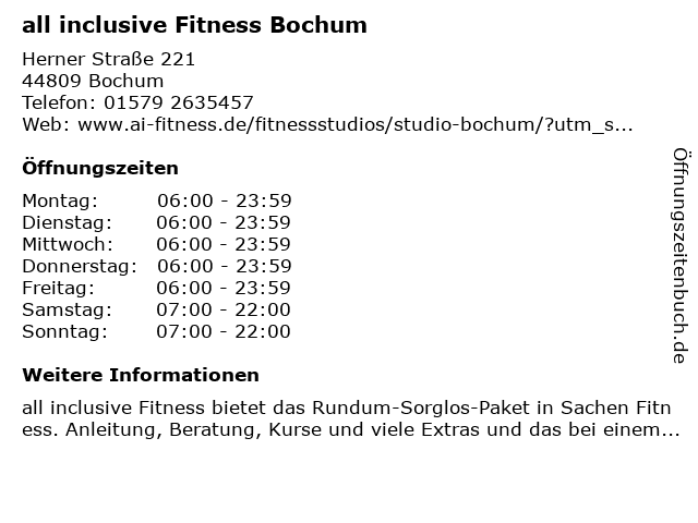 Egal ob in der Woche am Wochenende oder an Feiertagen wir sind an 365 Tagen im Jahr für Dich da. Fitness Bochum GmbH Unter der Nummer HRB 11701 beim Amtsgericht Bochum wurde die Firma Ai Fitness - Studio Bochum registriert. Herner Straße 221 44809 Bochum.